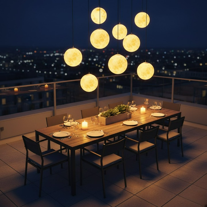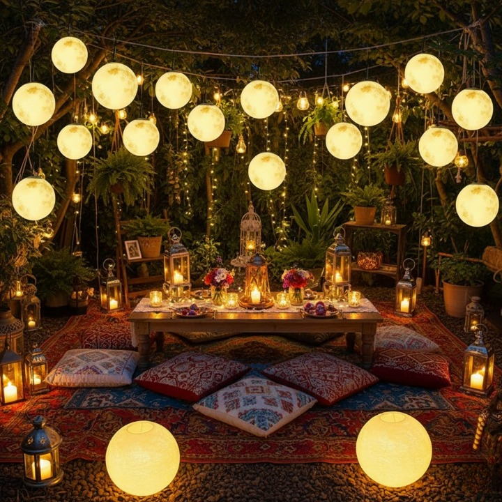 Ta wisząca lampa ogrodowa w kształcie księżyca wnosi nastrojową atmosferę do Twojej przestrzeni na świeżym powietrzu. Emituje subtelne światło, które każdego wieczoru przemienia ogród w bajkową scenerię, zachęcając do relaksu i odpoczynku.